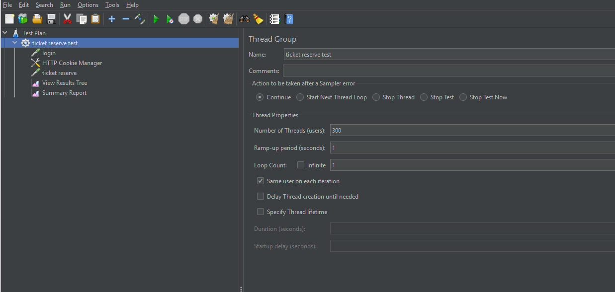 JMeter를 통해 '2026 싸이 흠뻑쇼 - 서울' 공연을 300명이 동시에 예매하기를 누른다고 가정하고 테스트를 진행하겠습니다.